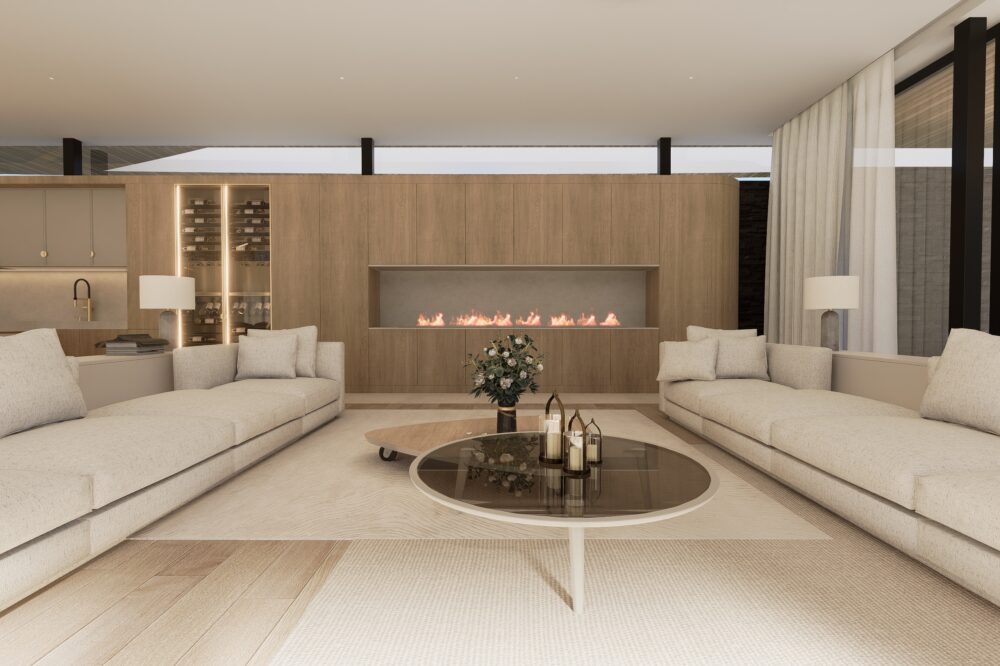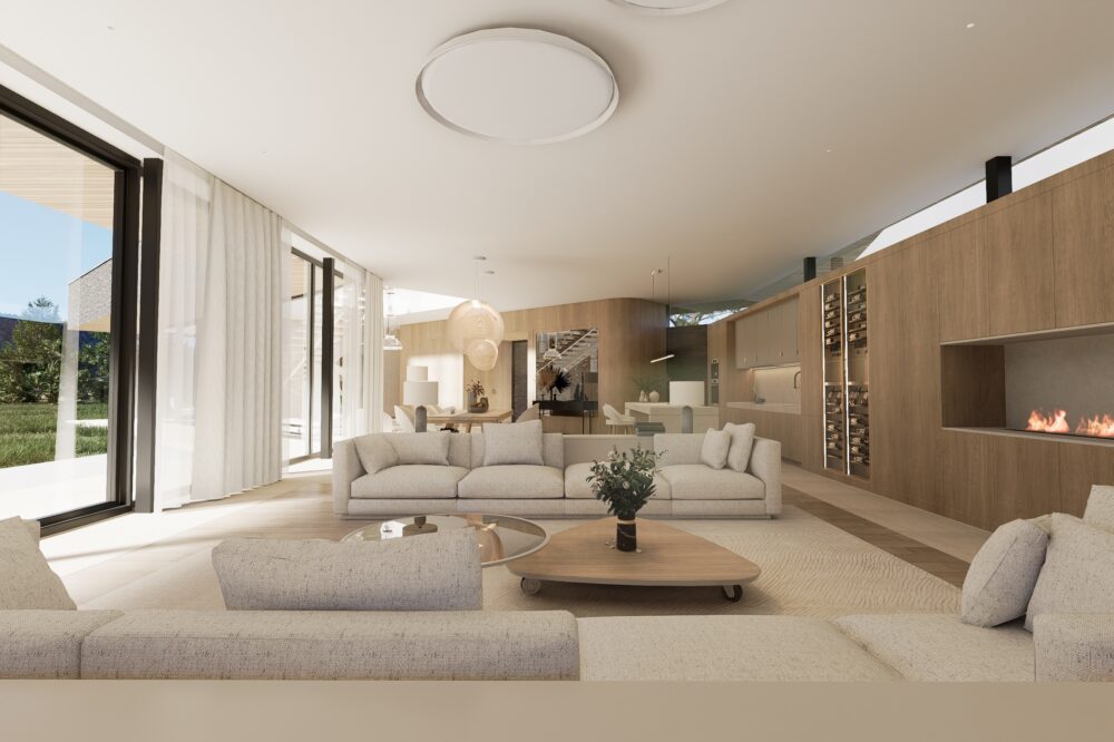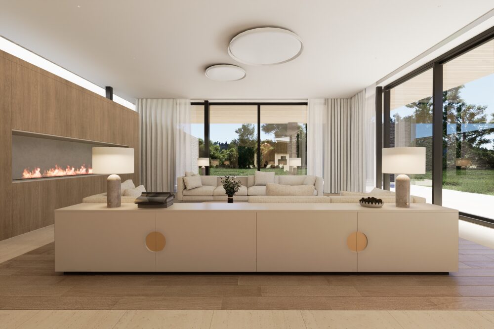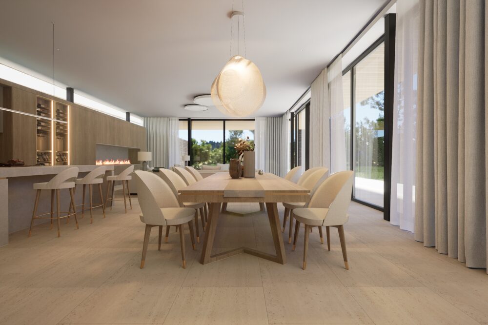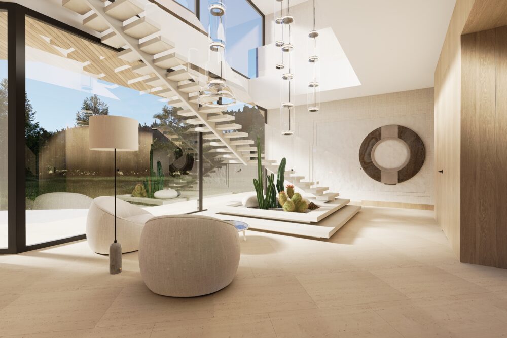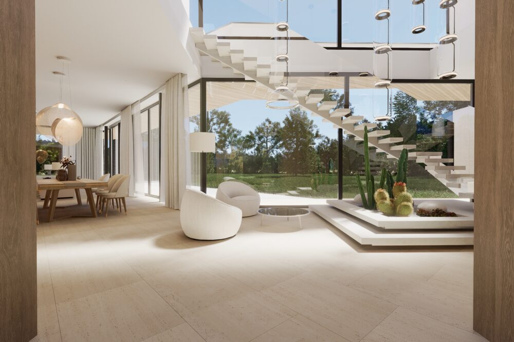 Przestronne i eleganckie wnętrze domu jednorodzinnego, w którym dominują ciepłe odcienie beżu, tworzące przytulną, a zarazem wyrafinowaną atmosferę. Naturalne materiały – trawertyn, bielony fornir oraz marmur – nadają aranżacji szlachetności i ponadczasowego charakteru.