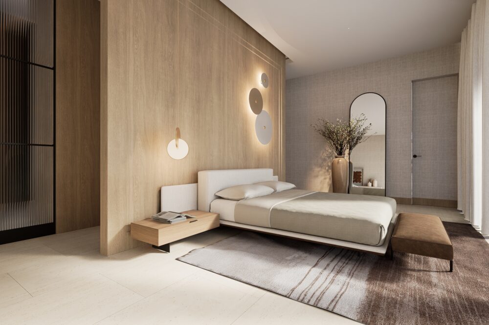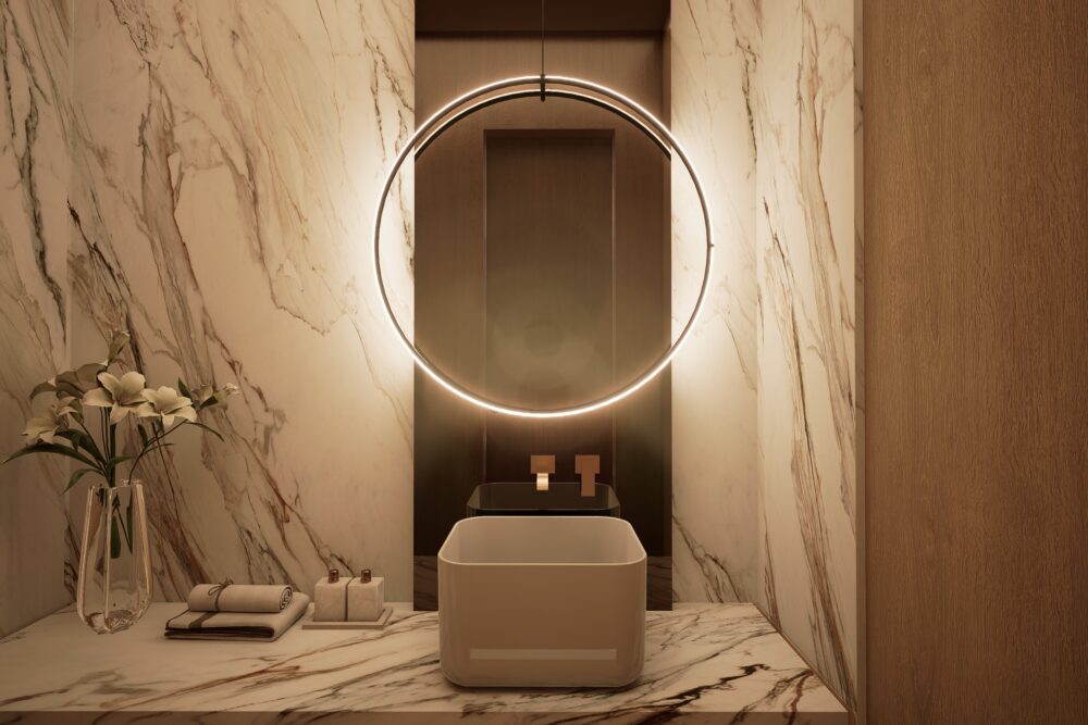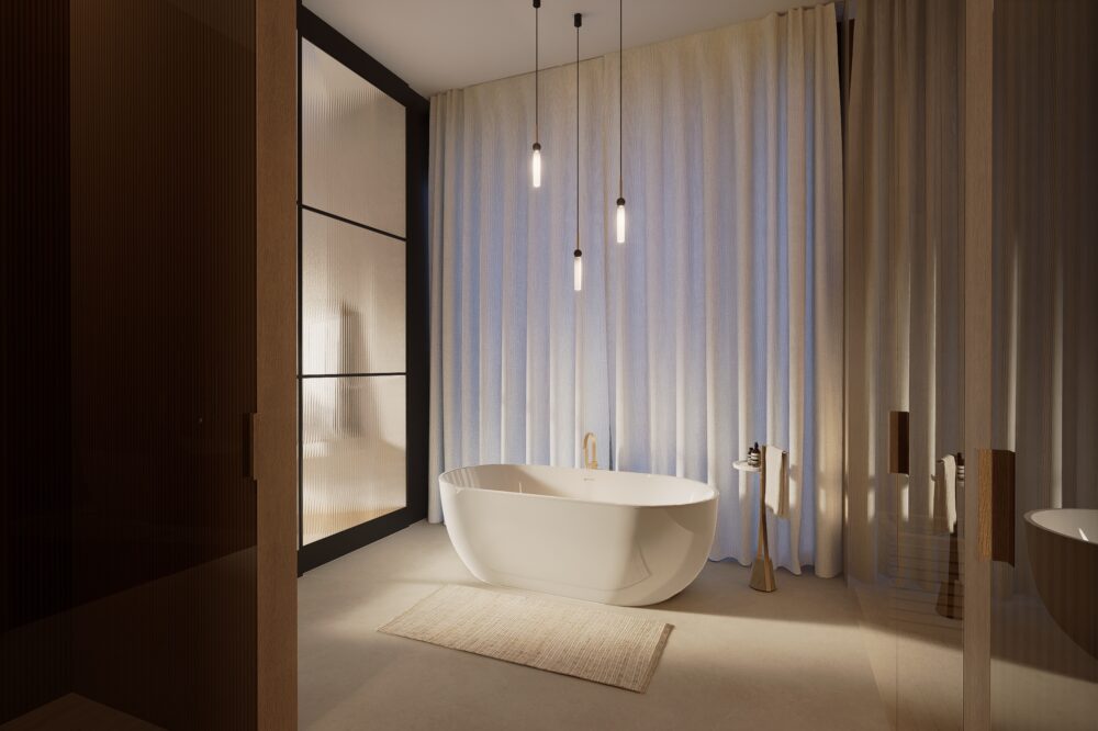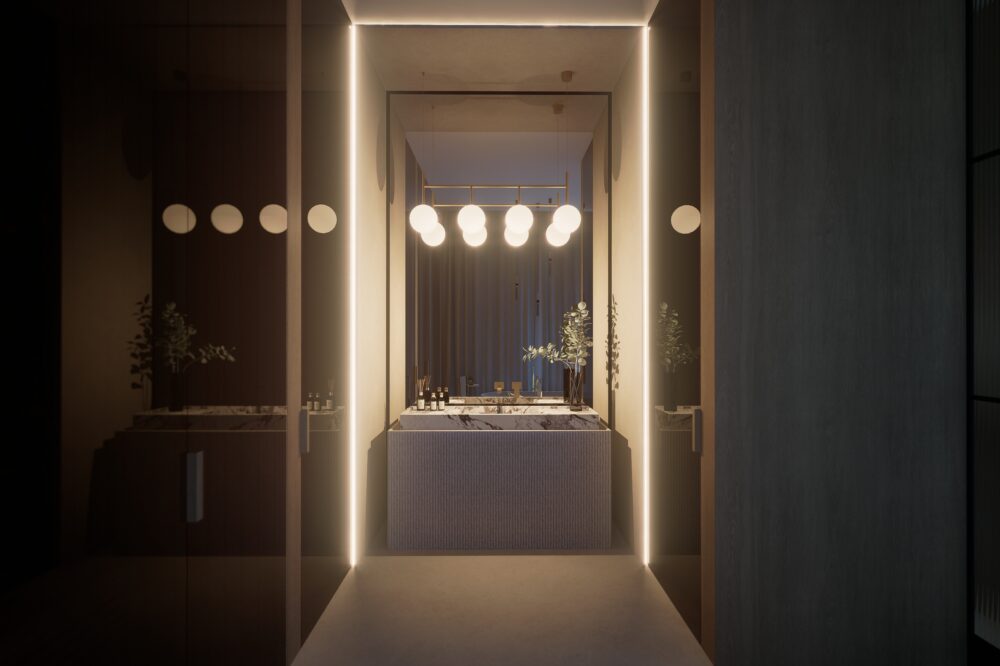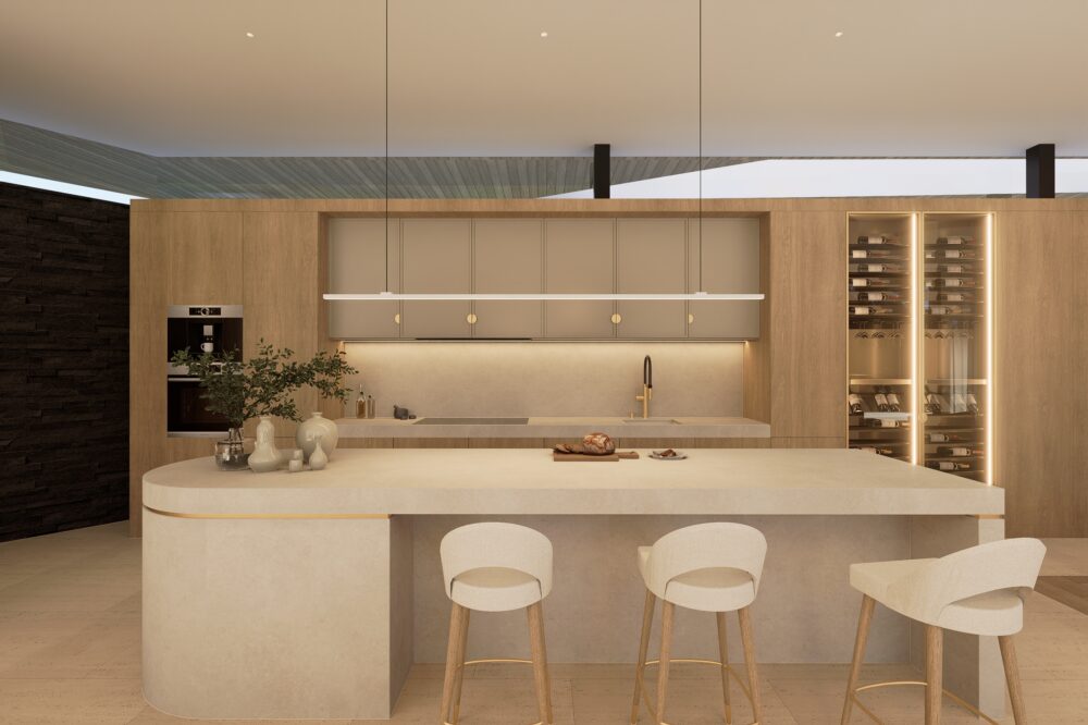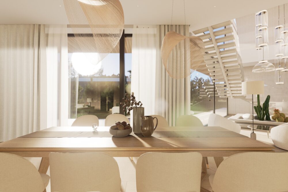 Przestronne i eleganckie wnętrze domu jednorodzinnego, w którym dominują ciepłe odcienie beżu, tworzące przytulną, a zarazem wyrafinowaną atmosferę. Naturalne materiały – trawertyn, bielony fornir oraz marmur – nadają aranżacji szlachetności i ponadczasowego charakteru.