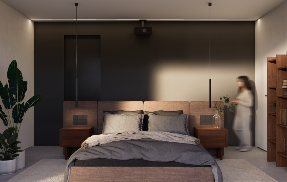 Projekt obejmuje minimalistyczną i wyciszoną część nocną w rozbudowanej części domu — prywatną strefę tylko dla rodziców. Zastosowane materiały są kontynuacją tych obecnych w pozostałych wnętrzach — surowy beton, czerń, odcienie szarości i naturalne drewno budują spójną, konsekwentną całość.