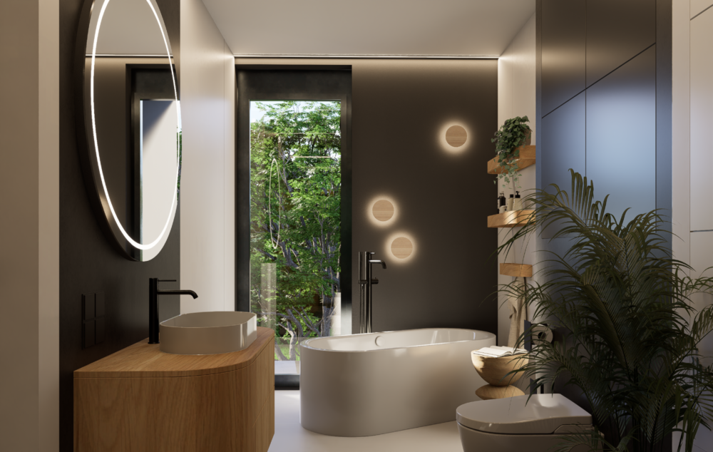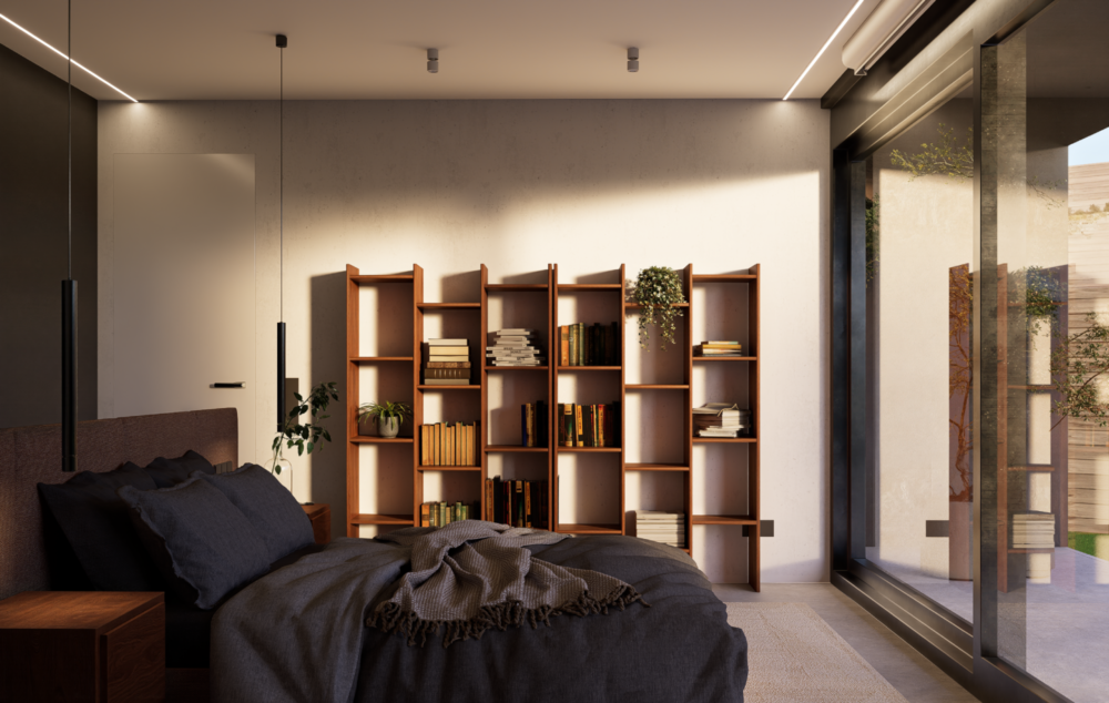 Ograniczona paleta, miękkie światło i proste formy porządkują wnętrze, a jednocześnie budują spokojne tło codzienności. Ponadto duże przeszklenia otwierają przestrzeń na zieleń i naturalne światło, dlatego wnętrze sprzyja wyciszeniu. Sypialnia i łazienka tworzą harmonijny duet — miejsce sprzyjające regeneracji i odprężeniu.