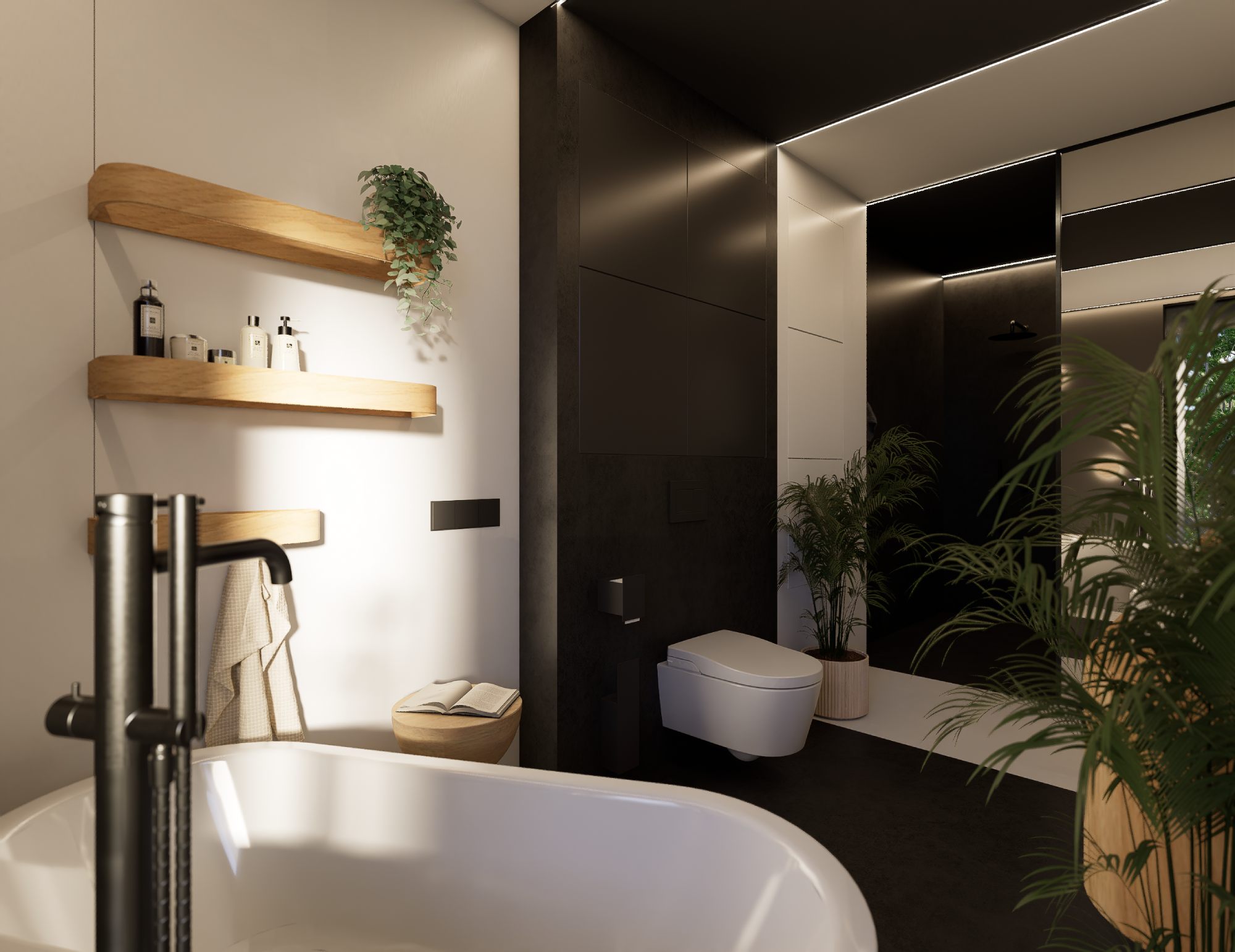 Ograniczona paleta, miękkie światło i proste formy porządkują wnętrze, a jednocześnie budują spokojne tło codzienności. Ponadto duże przeszklenia otwierają przestrzeń na zieleń i naturalne światło, dlatego wnętrze sprzyja wyciszeniu. Sypialnia i łazienka tworzą harmonijny duet — miejsce sprzyjające regeneracji i odprężeniu.